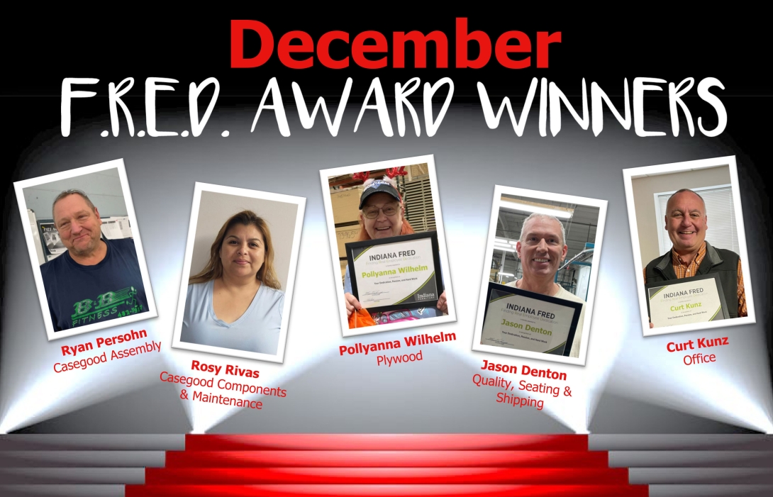 We choose a person from each facility every month and this month we congratulate: Ryan Persohn (Assembly), Jason Denton (Seating, Shipping, Quality), Pollyanna Wilhelm (Plywood), Rosy Rivas (Components, Maintenance), and Curt Kunz (Office).