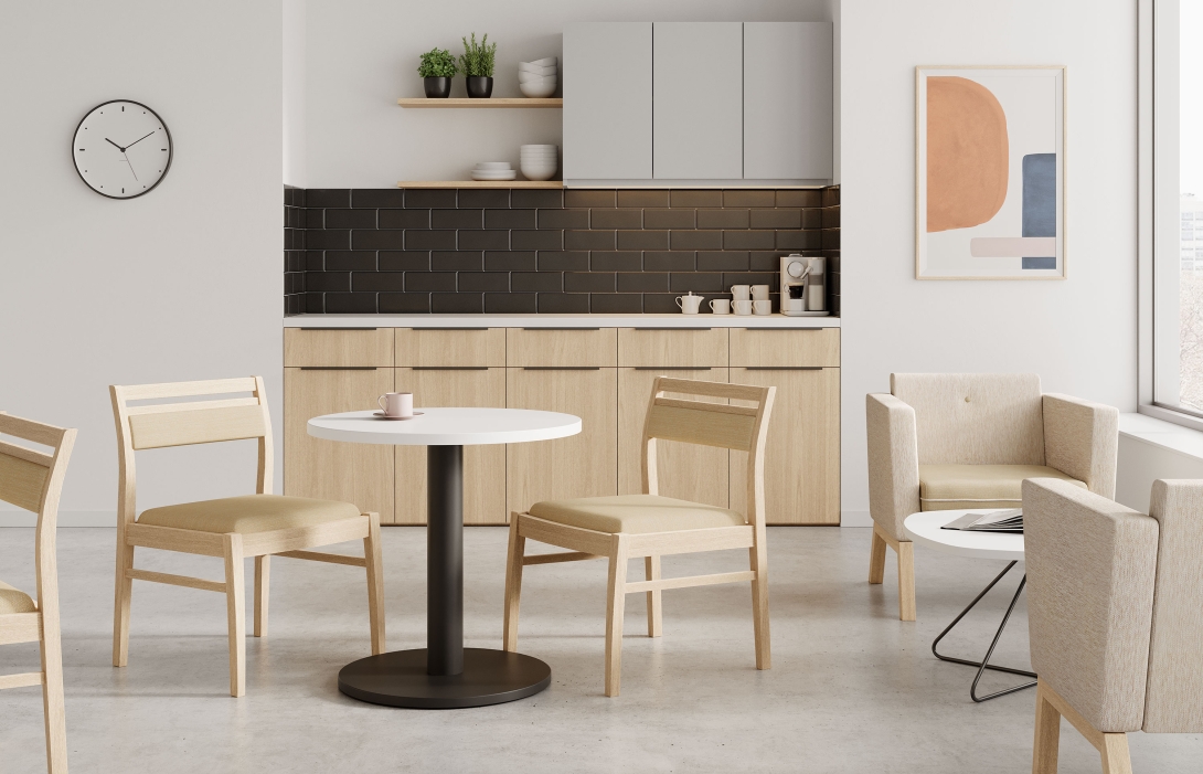 - Add storage and accessories, like buffets, integrated waste bins, lecterns, and more, to complete an entire space.