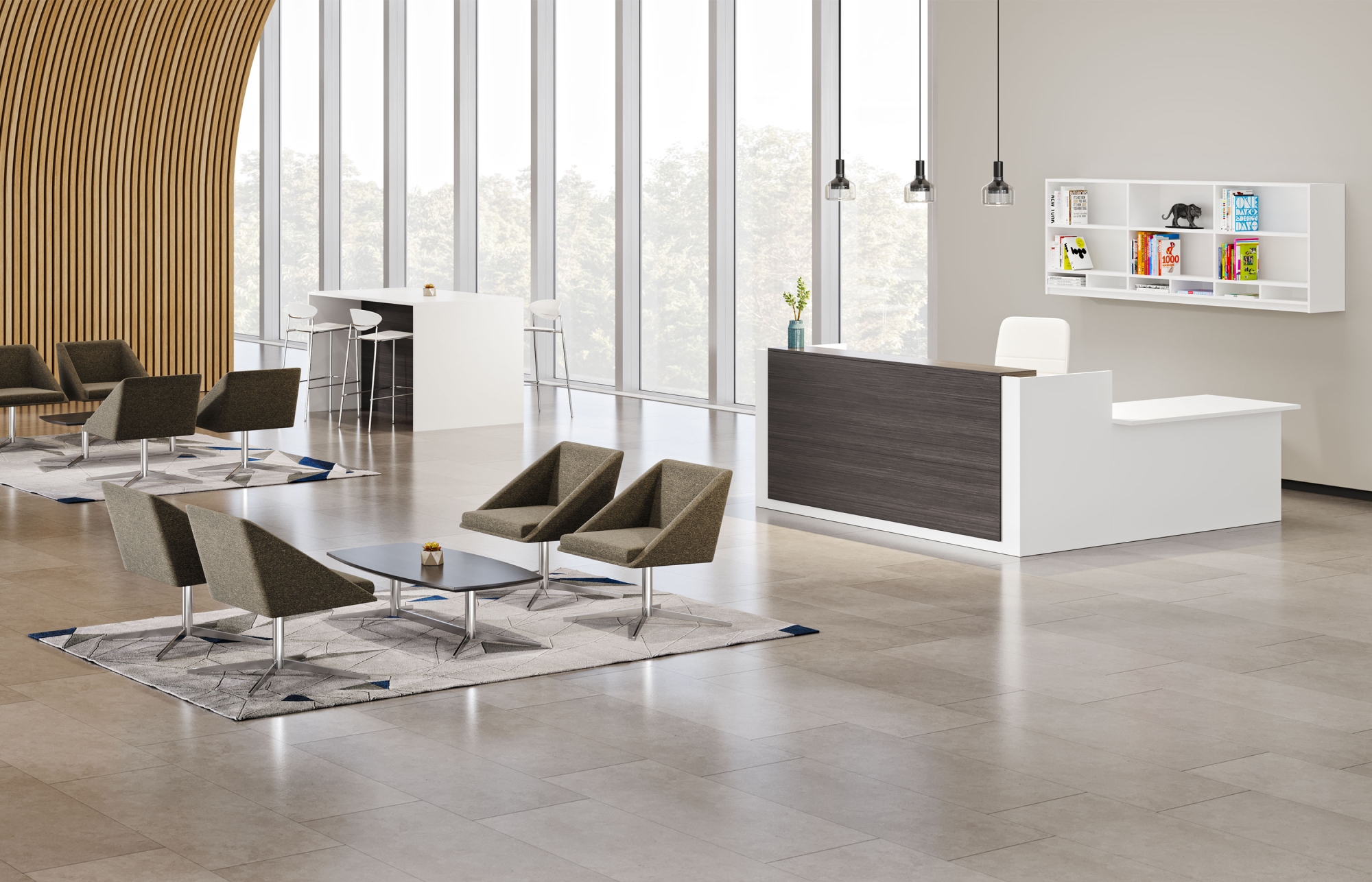 Canvas Reception shown in Black and Asian Night Laminate. Clutch and Isla Seating shown in Cortina Caprone Snow.