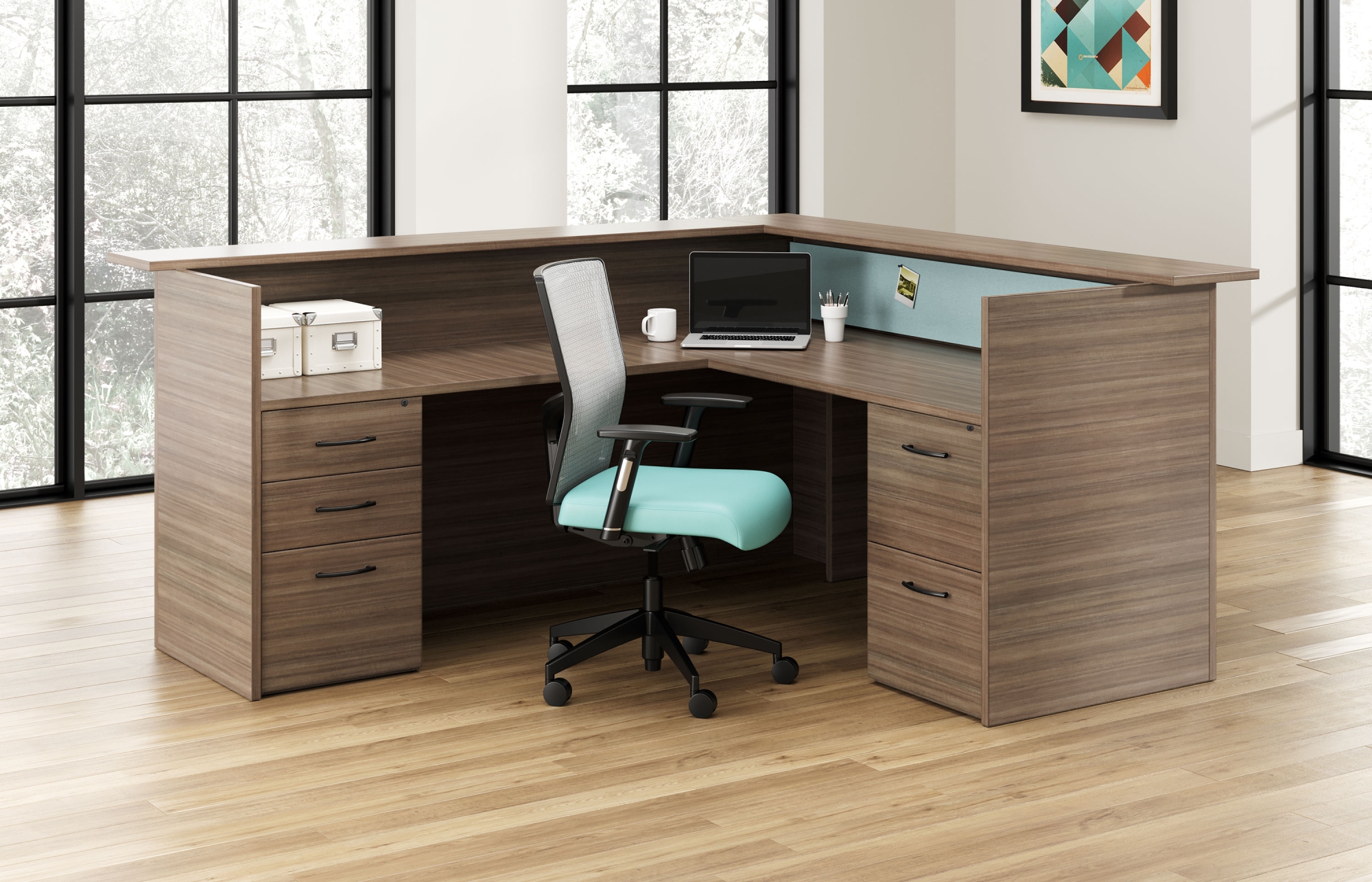 Canvas Reception shown in Studio Teak with Momentum Lana Airy Tackboard. Joy Task Seating shown in Architex Evolution Survival.