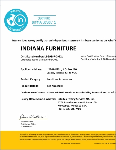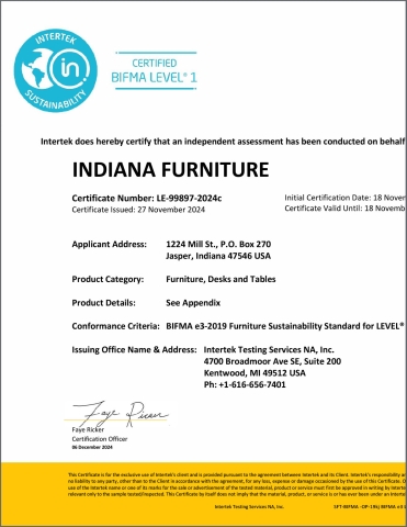 Certificates that verify our adherence to the BIFMA level Sustainability Standard and Guidelines.