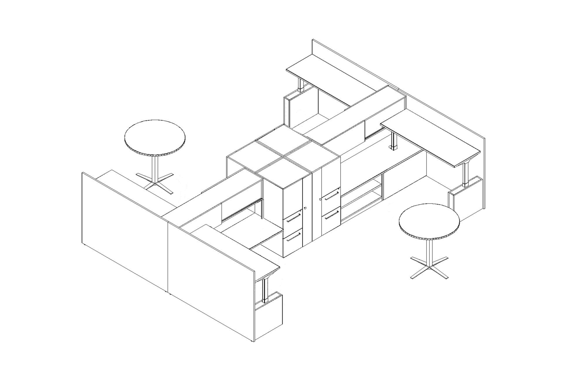 Integrated Height Adjustable desks allow users to move from sitting to standing and standing to sitting seamlessly throughout the day. Dry Erase Doors and Storage Towers elevate the space to create an inviting and functional shared office space.